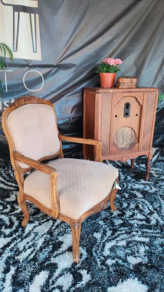Descripción: Este magnífico sillón Bergère es una pieza de declaración que encarna la elegancia y el confort del Rococó francés del siglo XVIII. Su estructura está tallada a mano en madera maciza de un tono marrón cálido, presentando exquisitos motivos florales, de volutas y de faja en el copete, los reposabrazos, la faja del asiento y las patas. El diseño Bergère se caracteriza por su respaldo redondeado y asiento ancho y profundo, con reposabrazos parcialmente tapizados (manchettes) que no se unen directamente al respaldo, creando un asiento envolvente y sumamente cómodo. Está tapizado en una tela beige texturizada de damasco con un patrón sutil de celosía que complementa la calidez de la madera. El borde de la tapicería está acabado con chinchetas decorativas de bronce.